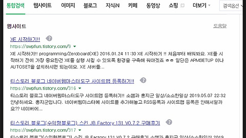 "https://swpfun.tistory.com"로 검색했을때 통합검색 블로그에 작성했던 글들은 모두 표시되지만 사이트 탭에서는 검색할 수 없다는 메시지가 뜰 뿐이네요..