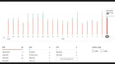 9월 초반에 다음 검색문제가 해결되고 이제는 구글검색과 다음검색이 비슷하게 방문자유입이 되어지고 있습니다. 그와중에 네이버 76건.. 네이버 쪽에서 블로그에 검색이 아닌 웹사이트에 표시되고 있기 때문에 노출도 안되네요.