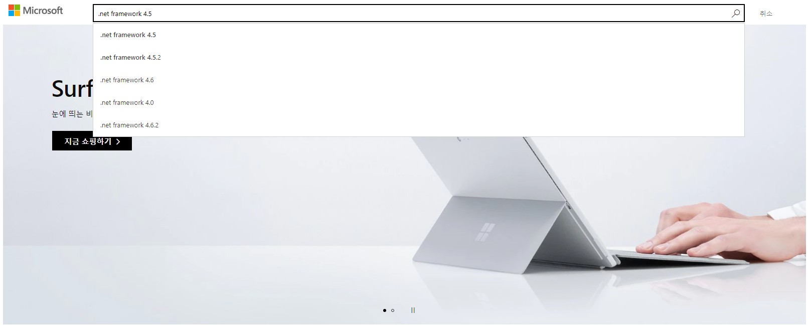 먼저 마이크로소프트 공식홈페이지에 접속해서 상단에 보이는 검색창에 자신이 설치하고 싶은 닷넷 프레임워크를 버전과 함께 입력합니다. 저는 .NET Framework 4.5 버전이 필요하기에 ".Net Framework 4.5"를 입력했습니다.
