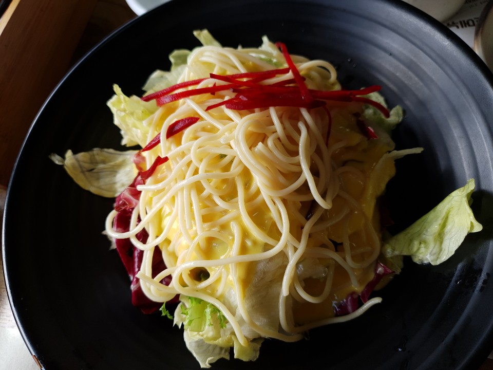 기본 반찬중에서 셀러드(파스타)?와 묵사발이 있는데요 개인적으로 처음에 기본에 나오는 셀러드랑 묵사발 맛있어요. 특히 여름철에는 묵사발이 생각나서 복사꽃핀집이 생각이 날정도에요..