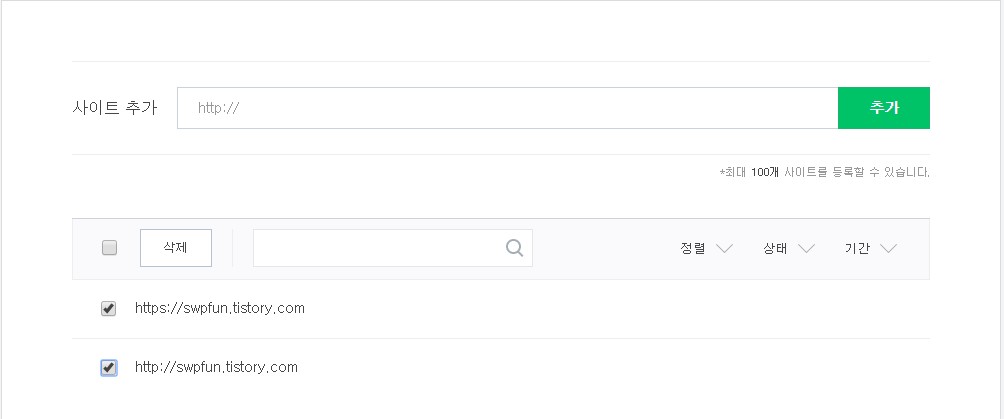 매번 검색등록을 해도 누락되기도 하지만 하나하나 검색을 해서 넣기도 귀찮고 웹마스터도구를 활용한다고 해도 티스토리 블로그에서 봇을 허용하는 방법이 별도로 없기때문에 이제는 웹마스터도구에서 티스토리 블로그를 해제하고 네이버 블로그에도 글을 작성하는걸로 2번에 나눠서 작업을 해야할 듯합니다.