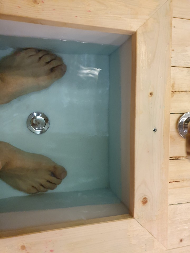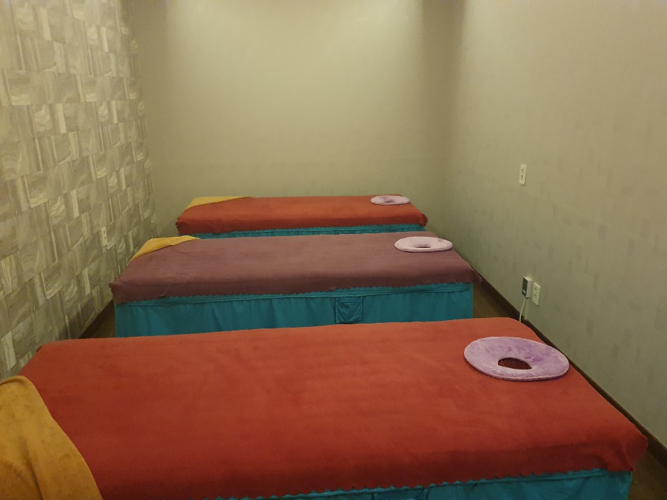 입구에 족욕하는 공간이 있는데 마사지를 시작하기전에 족욕탕에 발을 담그는데 남자는 파랑색 여자는 핑크색 물속에 발을 담그고 나서 시작했어요..