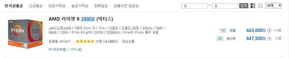 AMD의 3950x 출시가 다가오면서 3900X 정품 60만원대로 돌아왔다.