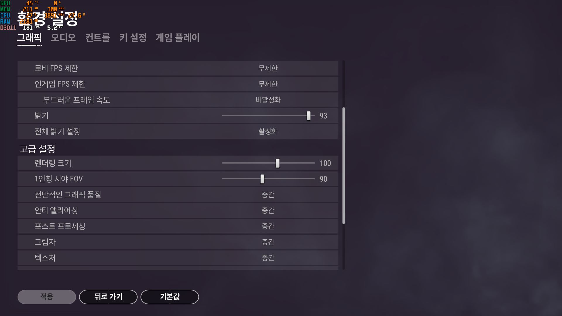 G3260과 동일하게 중간옵션으로 변경하고 테스트를 진행하니 80~100프레임 초반까지 나와줍니다. 높음 옵션으로 설정하고 게임을 진행하다가 약간의 잔랙현상과의 타협을 위해서는 중간옵션으로 설정하고 필요한 몇개의 설정만 높음 옵션으로 변경한다면 게임을 플레이하는데는 큰 문제가 없었습니다.