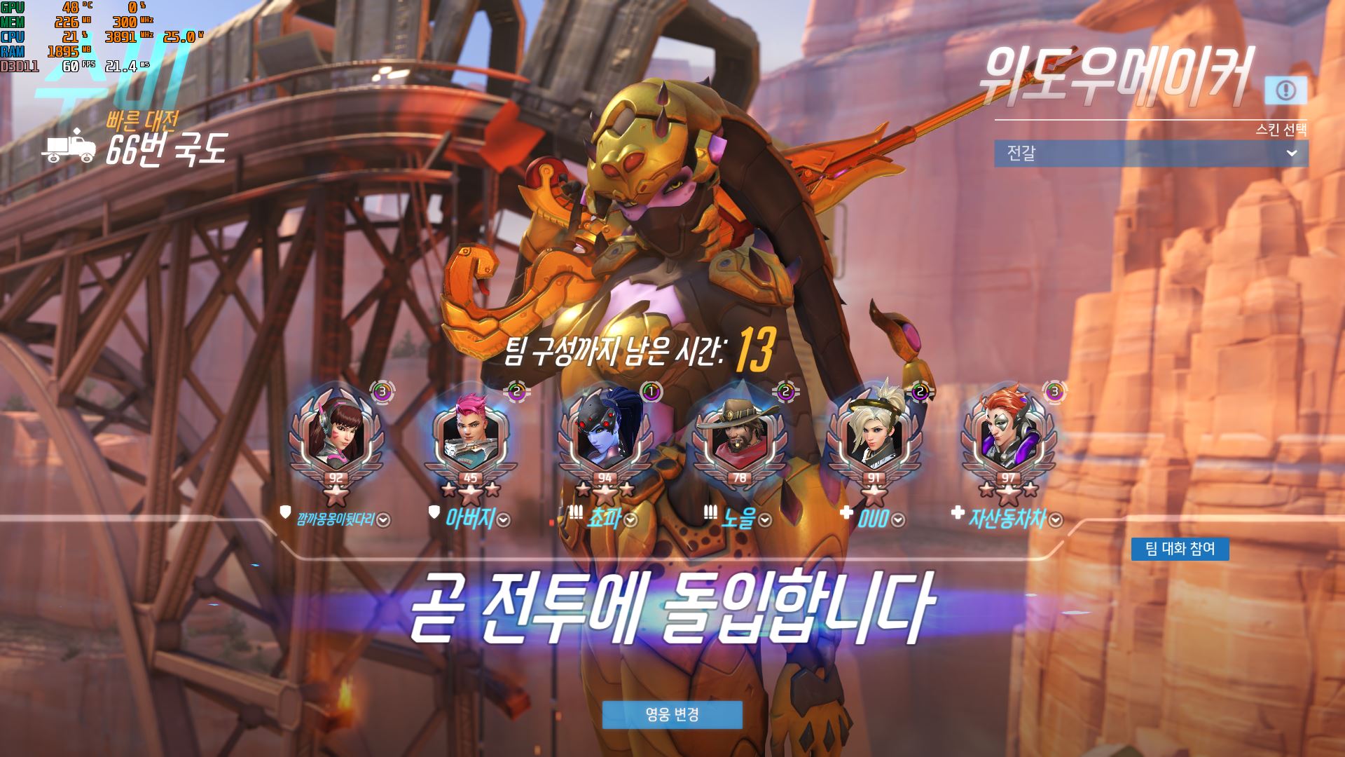 오버워치는 높음과 매우 높음 두가지로 플레이를 진행했고 둘다 60프레임정도 나왔습니다. G3260에서는 높음에서도 40프레임을 유지했던거에 비해서 20프레임 정도 더 높게나왔는데 그만큼 게임을 플레이할때 더 부드럽고 잔랙현상도 많이 줄어들었습니다.