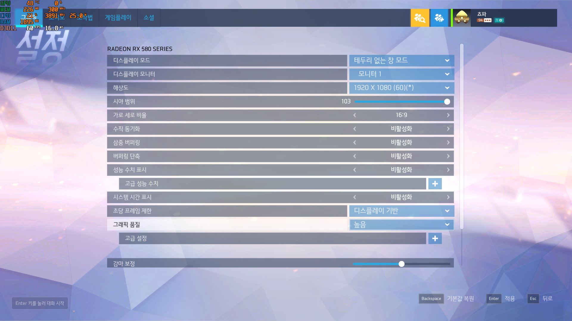 오버워치는 매우 높음으로 했을때도 괜찮게 플레이가 가능합니다.
