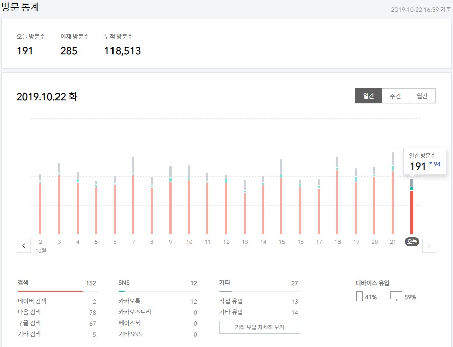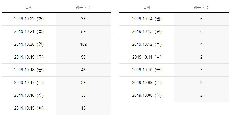네이버 블로그에서는 일 방문자수가 주말인 토, 일 빼고는 30~50명정도로 방문자수가 유입되고 있어서 티스토리와 별도로 올리는 거니 티스토리와 합치면 300명정도라고 봐도 될지 모르겠네요.. .. 이제 목표는 티스토리만 300명이지만..
