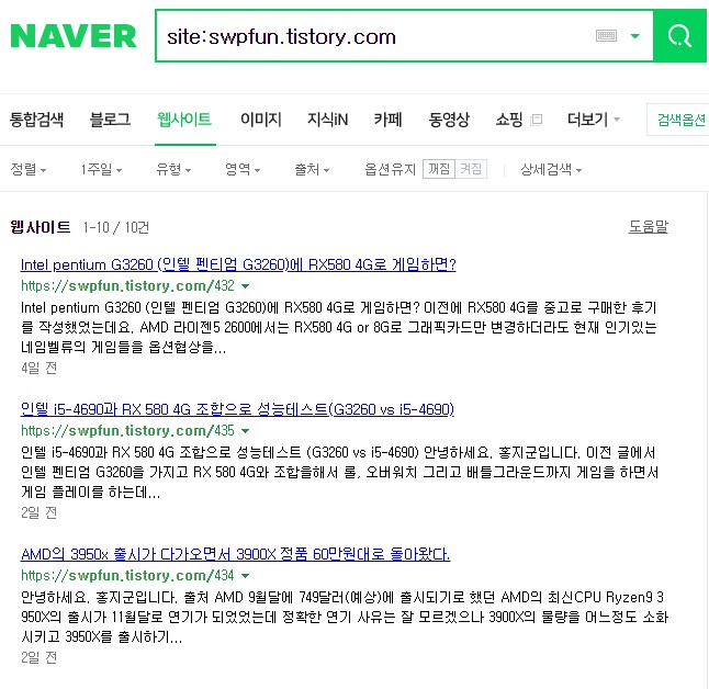 그런데 네이버에서 제 티스토리 블로그글을 웹사이트로 수집하고 있었어요.. 웹마스터도구를 사용했을때에는 그렇게 안가지고 가던게 네이버웹마스터도구를 해지하고나서는 슬금슬금 하나하나씩 웹사이트에 긁어갔더라고요..