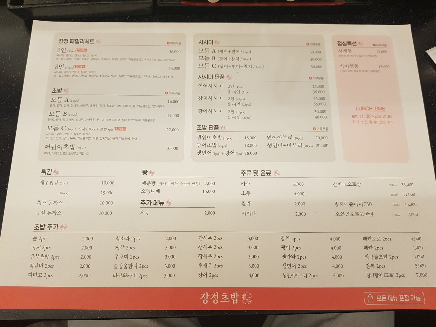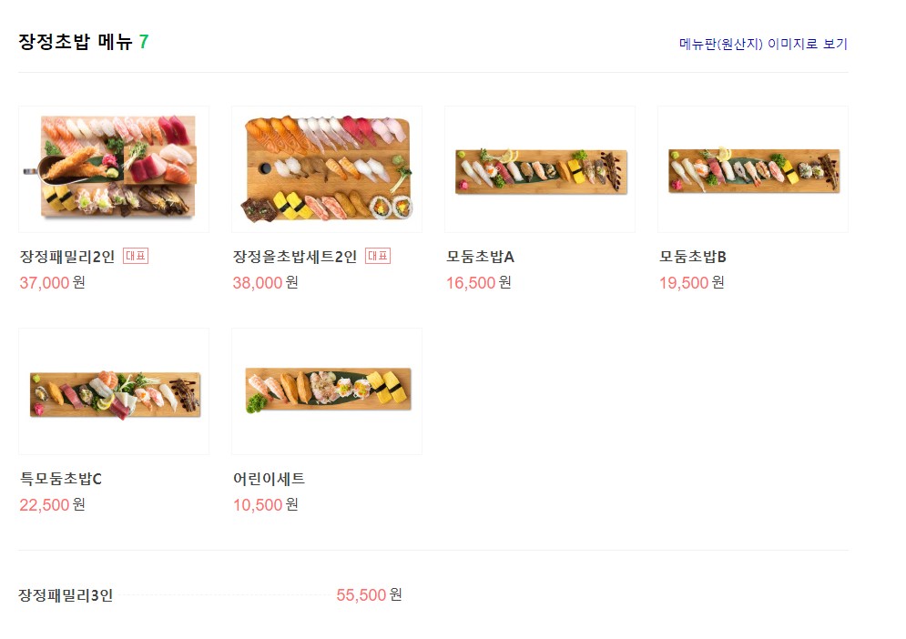 몰랐는데.... 이번에 먹은 메뉴가 지난번에 찍은 메뉴판에 없다는걸 몰랐어요... 그래서 메뉴판을 따로 안찍었는데.. 장정페밀리 세트에 "장정 올초밥 세트" 2인 38,000원 3인 57,000원 짜리 메뉴가 있었는데... 이전에도 있던건줄 알았는데.. 아니였어요..