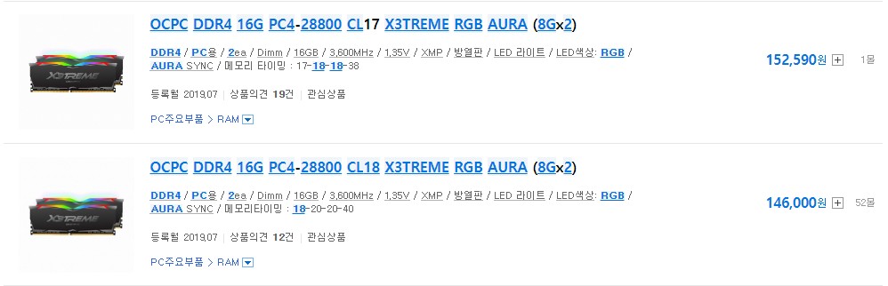 다음으로 램은 OCPC DDR4 16G PC4-28800 CL18 X3TREME RGB AURA (8Gx2)를 선택했는데... 일단 16GB구성에 XMP 3,600MHz를 사용하다가 다시 돈좀 모이면 커세어나 지스킬로 16GB *4EA 총 64GB를 구성할려고 합니다. 가격은 대략 50~70만원정도 하는 것 같네요.