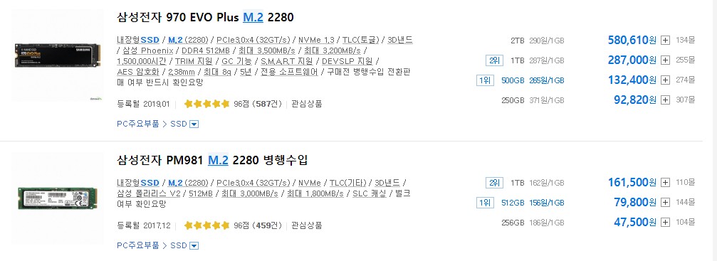 SSD는 다나와 조립PC선택에서는 삼성전자 970 EVO Plus M.2 2280 500GB로 선택했습니다 SSD는 역시 샘송이죠~ .. 가격은 1TB는 거진 30만원이라서.. 이것까지는... 무리할 필요 없이 보조 하드디스크나 SSD 128GB를 2장정도 더 사용하는 걸로.. 아니면 뽐뿌에 M.2 저렴하게 나오면 그때 준비해야겠어요.