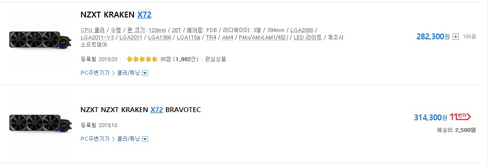 마지막으로 쿨러는 NZXT 크라켄 X72 3펜 라디에이터 가격은 28~30만원 입니다. 누수정책도 있고 RGB감성에 기본 펜도 괜찮은 것 같다는 느낌이 드네요...