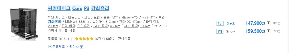 케이스는 오픈형 케이스로 서멀테이크 core P3 강화유리 Snow 제품을 구매할 예정입니다. 오픈형 케이스로 커스텀수냉 PC조립시 내부를 들여다보기 좋고 LED간지를 그대로 느낄 수 있기때문입니다!!