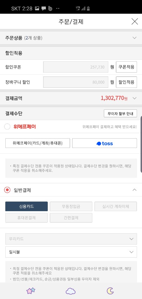 0원에서 쿠폰 할인 받아 691,410원 신용카드로 결제하니 8%정도 할인을 받아 약 65만원정도로 총 25%를 받을 수 있었습니다.