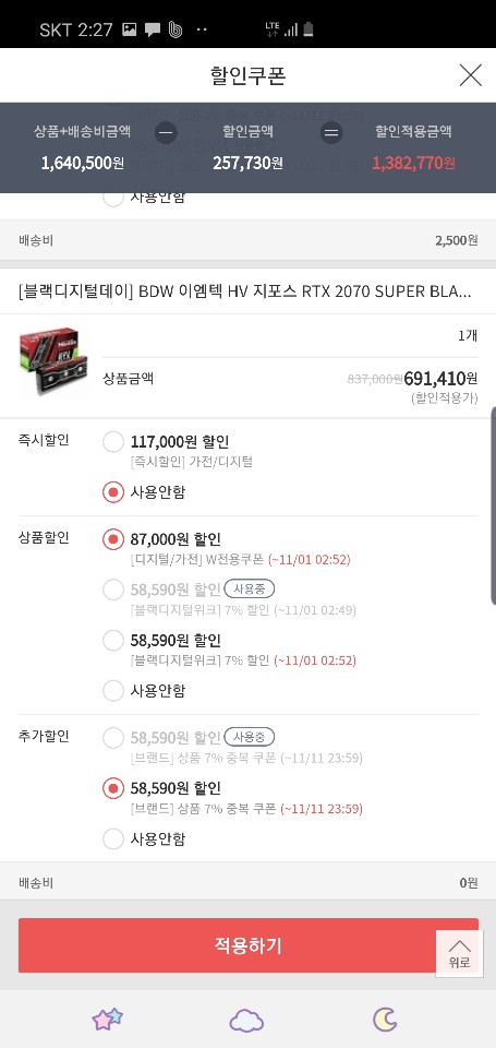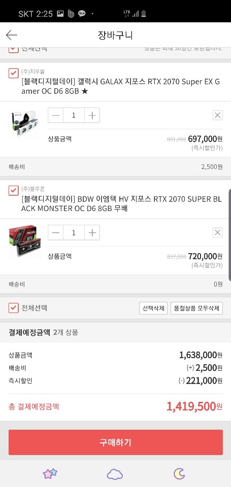 갤럭시 RTX 2070 super EX gamer OC D6 8G , BDW 이엠텍 HV 지포스 RTX 2070 SUPER BLACK MONSTER OC D6 8G 이렇게 두개를 구매했습니다. 할인은 257,730원 + 80,000원 = 총 337,730원 할인받았지만 평소 판매가를 기본으로 잡고계산