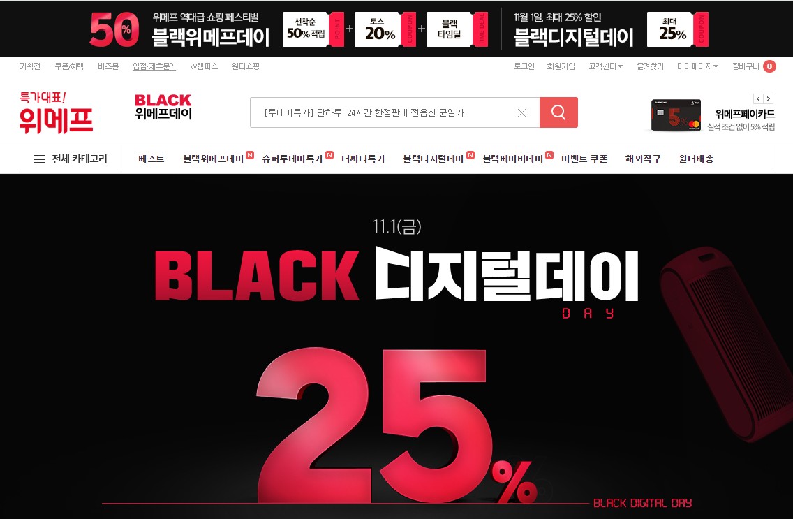 11월 1일 부터 위메프에서도 블랙위메프데이, 블랙디지털데이, 블랙베이비데이 등등 다양한 블랙이벤트를 통해 쿠폰 10%, 브랜드 중복 7%, 카트 장바구니 8% 최대 25%까지 할인을 하는 이벤트가 진행중입니다.