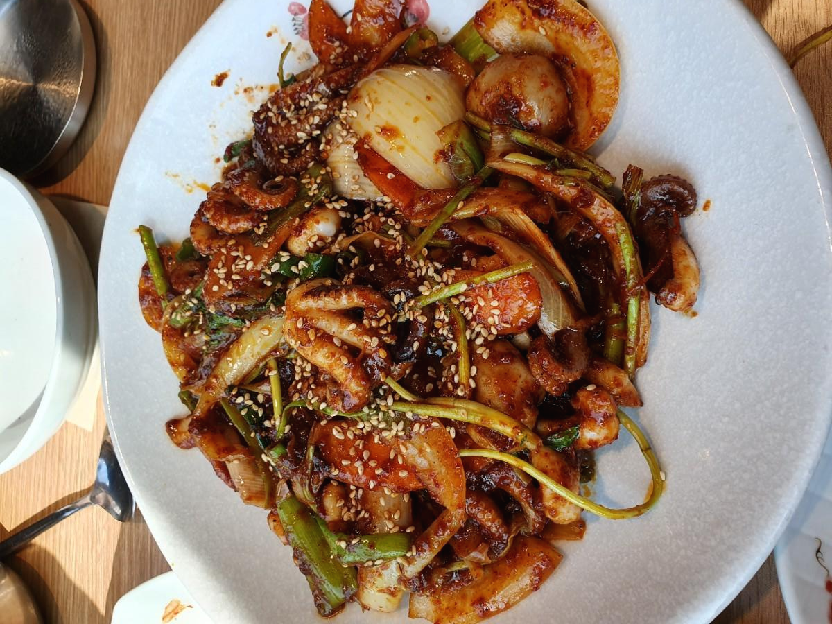 메뉴에는 없지만 미나리가 들어간 쭈꾸미볶음입니다. 사장님께서 메뉴판에는 아직 없지만 맛있다고 추천해주신 쭈꾸미 볶음 입니다 쭈꾸미볶음에는 공기밥이 안나온데요.. 그런데 메뉴판에 없는 메뉴라 그런지 공기밥 2개를 서비스로 주셨어요. 이게 살짝 매콤하고 살짝 단맛도 있고 미나리가 들어가서 미나리 향과 불맛까지 더해져서 너무 맛있었어요...