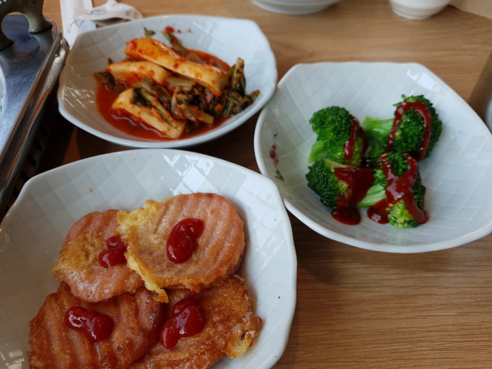 기본 꽃게탕을 시키니 기본 반찬으로 어묵조림, 김치, 묵, 번데기, 분홍햄, 브로콜리, 총각김치 이렇게 나왔습니다~ 번데기는 징그러워서 잘 못먹지만 가장 좋아하는 메뉴인 분홍햄이 반찬으로 나와서 너무 좋았습니다. 가끔씩 일할때 식당에서 백반배달시킬대 분홍햄이 반찬으로 나오면 더먹고 싶어서 눈치를...