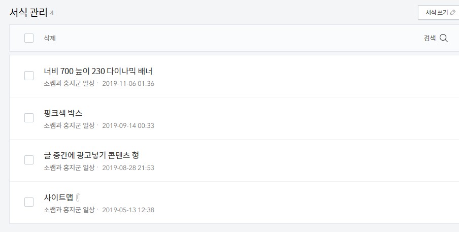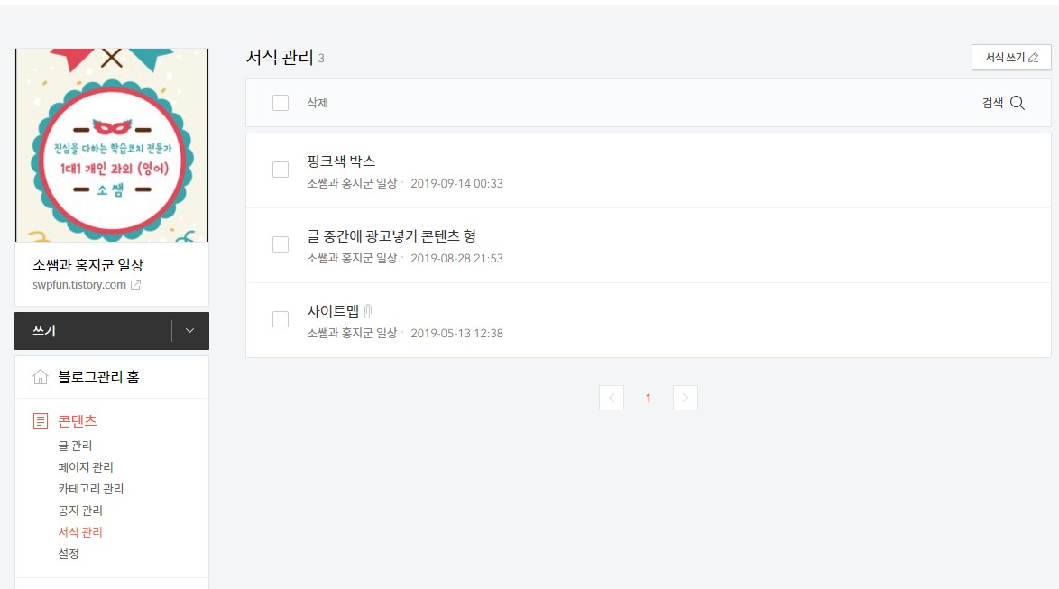 "파트너스 코드"가 생성되었다면 이제는 티스토리에서 "관리" -> 콘텐츠 의 "서식 관리" 항목으로 이동해 "서식 쓰기" 버튼을 클릭합니다.