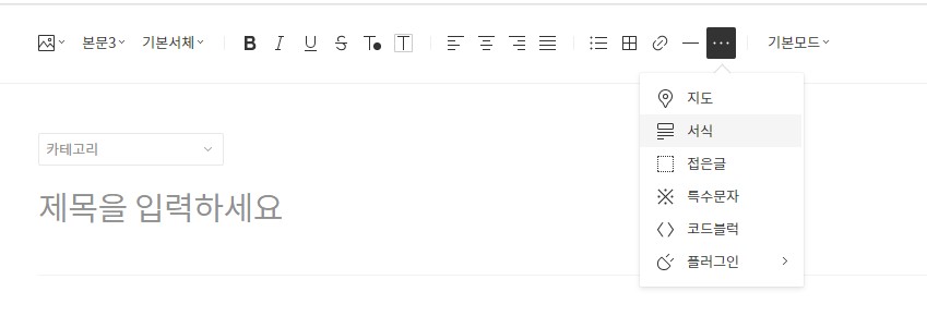새로운 글쓰기를 한뒤에 "기본 모드" 왼쪽으로 "ㆍㆍㆍ" 으로 되어있는 걸 클릭하게 되면 지도, 서식, 접은글 등등 의 항목을 볼 수 있는데 그중 서식 항복을 클릭하게 되면 "서식"창이 뜨고 이전에 등록했던 쿠팡 파트너스 서식글을 볼 수 있는데 해당 서식을 눌러줍니다.