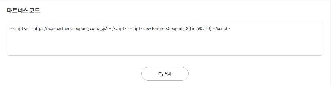 "배너 만들기"버튼을 눌러 배너를 생성하게 되면 바로 아래 "파트너스 코드" 항목이 생기고 스크립트 언어가 생성되어 집니다.