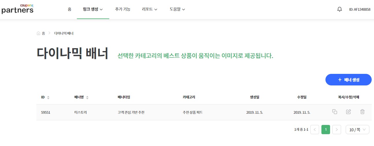 먼저 쿠팡 파트너스 홈페이지에서 "링크생성"-> "다이나믹 배너" 항목으로 이동합니다.