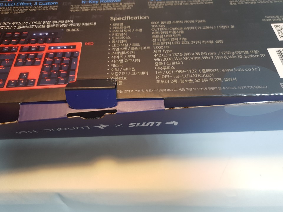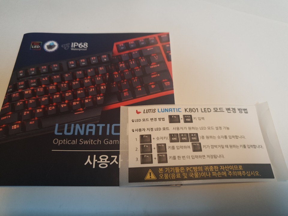 루나틱 K801 제품 박스를보면 처음 눈에 들어오는것은 상자의 오른쪽 상단에있는 IP68 인증과 광축버튼 그리고 빨간색의 LED가 눈에 들어옵니다. 갤럭시S8과 갤럭시S9와 동일한 IP68방수방진으로 1.5M 수심에서 30분이상 방수가 되는 제품으로 컴퓨터를 사용중에 키보드에 물이 들어가도 걱정없이 사용할 수 있고 지저분한 키보드를 물로 씻어낼 수 있습니다.