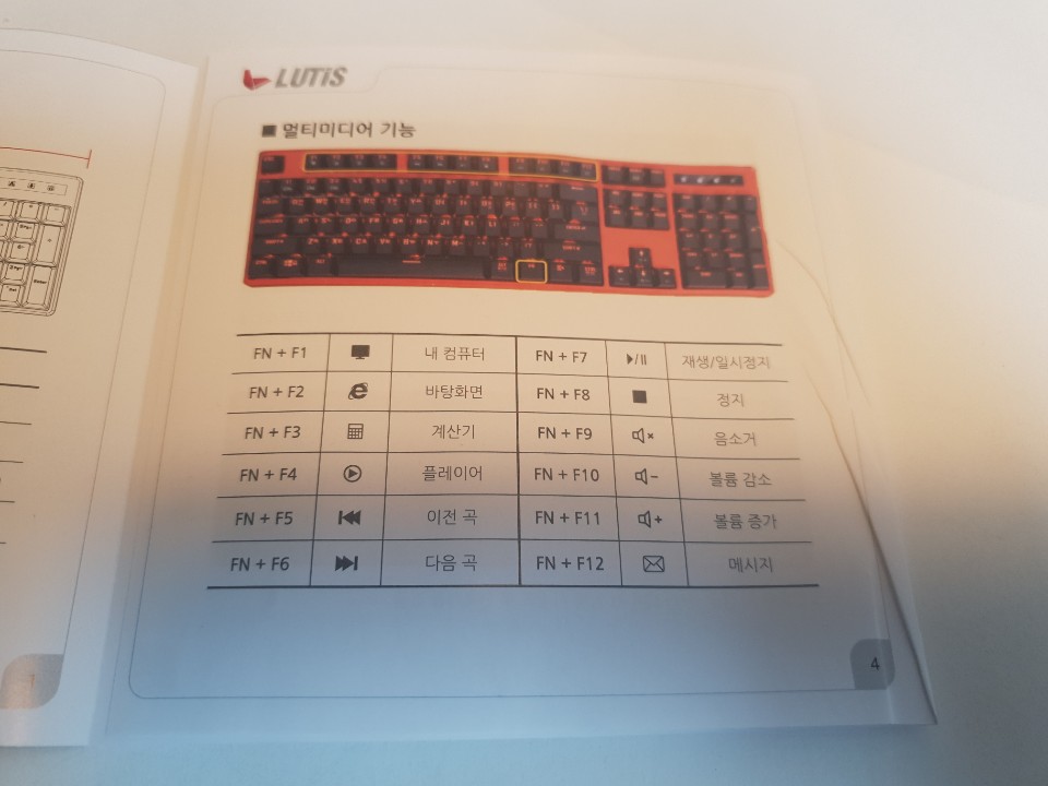 키보드의 구성품은 키보드, 리무버 2종, 청소솔, 오테뮤 축 2개, 설명서 입니다. PC방에 많은 판매가 되는 제품인지 PC방에서 붙일 수 있는 스티커를 같이 받았습니다. 스티커에는 간단한 LED 모드를 변경하는 방법이 나와있고 설명서에는 LED 모드 설정방법 이외에 멀티미디어 기능까지 사용까지 알려주고 있습니다.