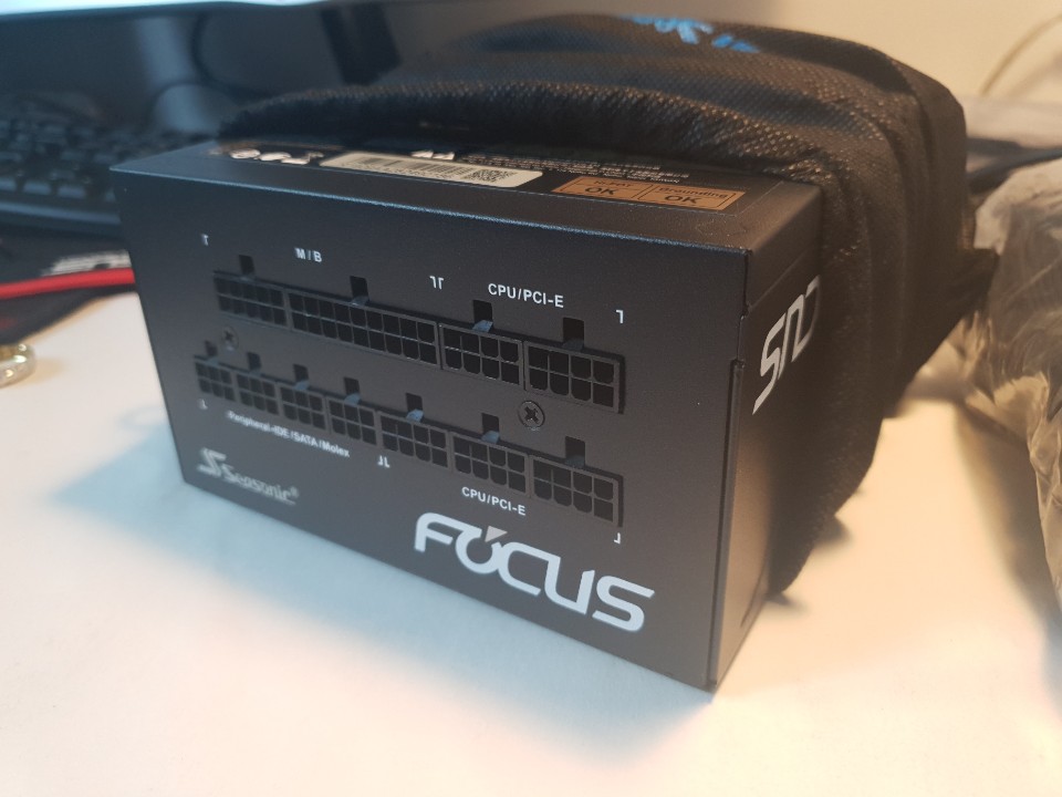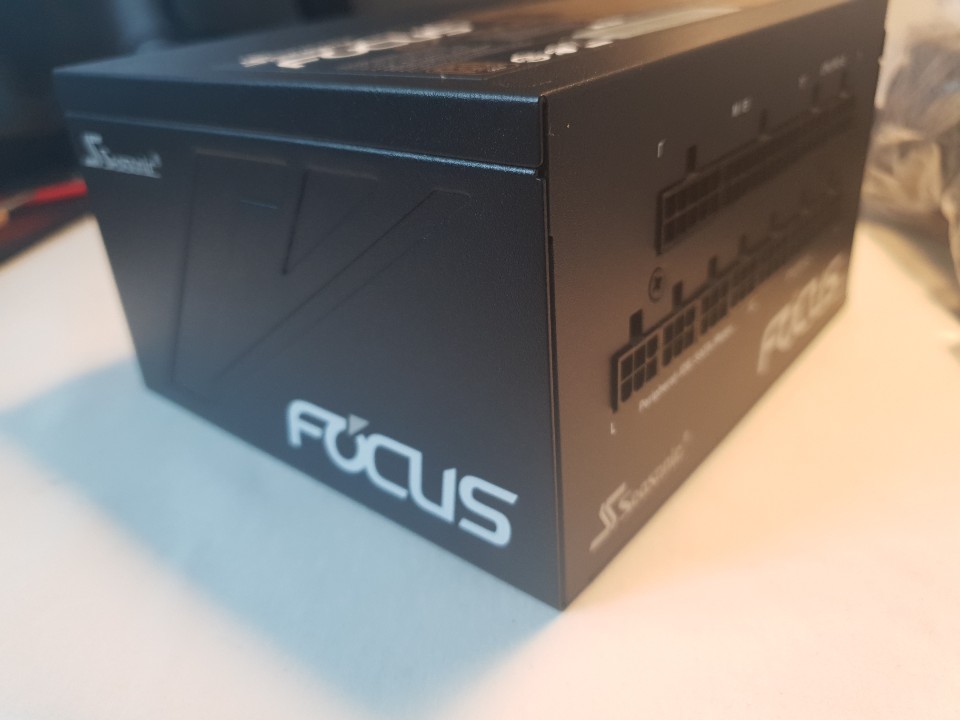FOCUS GX-1000은 ATX파워서플라이 폼팩터(140*150*86mm)로 미들타워 케이스에 장착해서 사용해도 선의 간섭이 없이 장착이 가능합니다. 파워에는 거의 모든방향에 시소닉 마크와 FOCUS 등급 마크가 표시되어있습니다