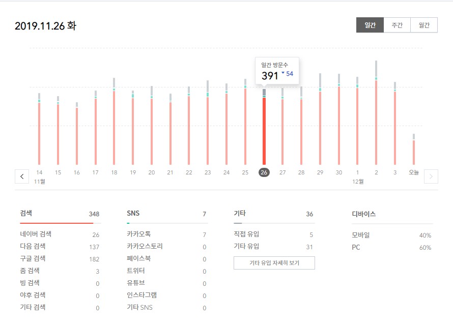 10월달에는 200명 중, 후반정도의 일간 방문자수였던 블로그가 11월에는 300명 후반에서 400명 초반때의 방문수를 보유하게 되었습니다. 8월 이후 하루 방문자수가 매월 100명씩 증가하고 있어 블로그의 성장을 지켜보면서 뿌듯함을 느끼는 중입니다.