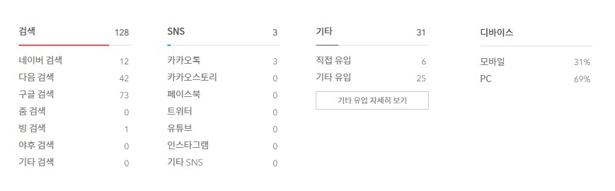 SNS부분도 페이스북, 트위터, 유튜브, 인스타그램 등등 다양한 매체해서 어떻게 유입되어지고 있는지 세부적으로 볼 수 있도록 변경되었습니다. 카카오톡을 제외하고 아직 페이스북이나, 트위터, 인스타그램등을 하지 않아서 저한테는 아직 관심없는 부분이기도 합니다.