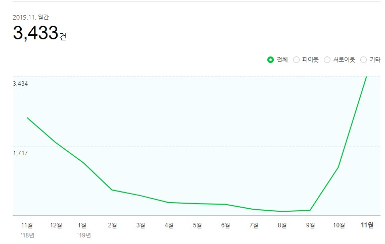 여전히 제 티스토리글이 네이버에서 검색이 잘 되지않아 네이버 검색유입이 낮아 별도의 네이버 블로그를 따로 관리해 티스토리와 네이버 블로그 2개를 동시에 운영중인데요. 네이버 블로그의 11월 방문자수는 3,433건입니다. 네이버 블로그도 10월달에 비해서 방문자수가 많이 상승했습니다.