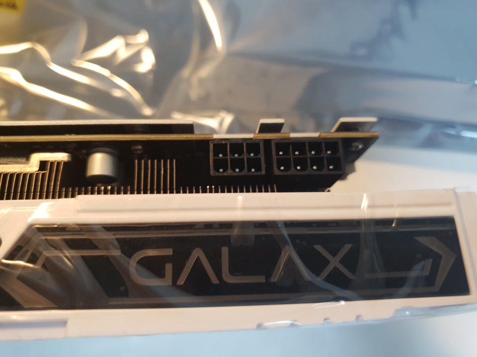 이엠텍의 제품은 8+8핀의 전력인데 갤럭시 제품은 6+8핀을 사용하네요. 전연연결 밑에 GALAX 부분은 컴퓨터를 켰을때 LED가 들어와서 간지가 나기는 하지만 살짝 아쉽게 너무 작은 느낌이 들기도하고 옆에 GEFORCE RTX까지도 LED 불이 들어왔다면.. 더 멋지지 않았을까 하는 생각을 해봅니다..