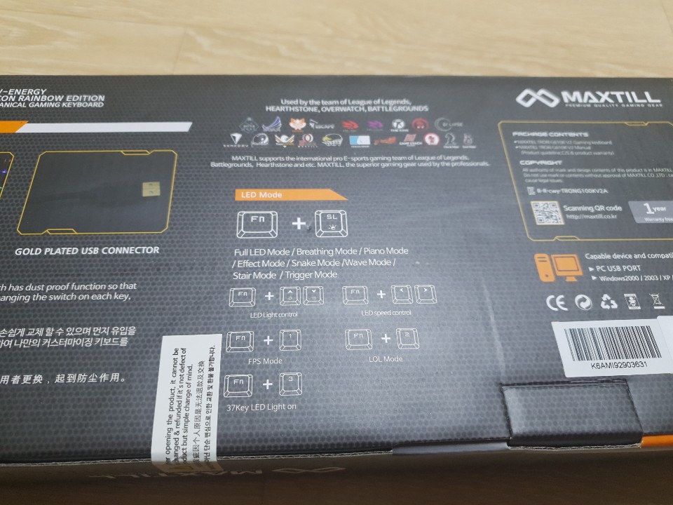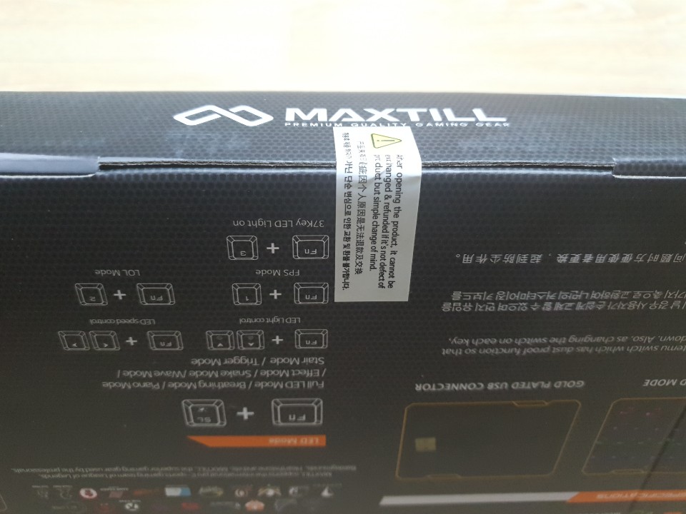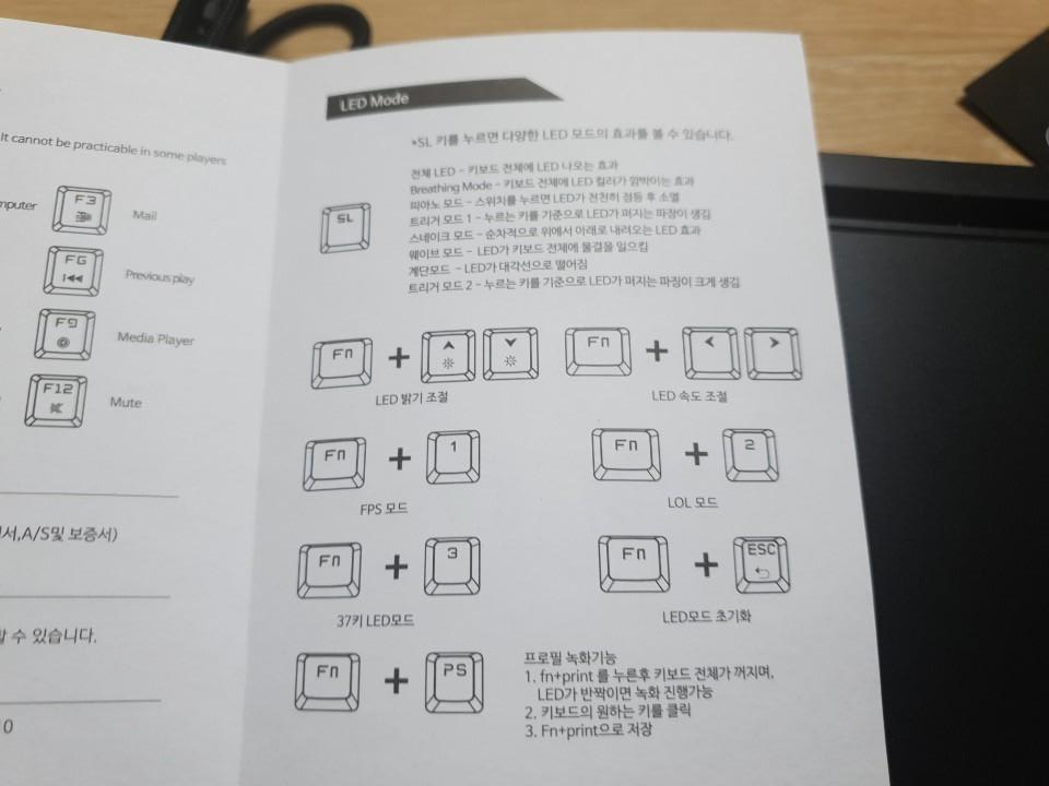 또한 Fn + 1,2,3 or ScrLk 버튼을 통해서 LED의 모드를 변경할 수 있고 FN + 방향키를 통해서 밝기조절과 속도 조절까지 가능합니다. 특히 단축키 세팅으로 Fn +1 FPS, Fn +2 LOL, Fn +3 37Led 기능으로 FPS게임과 LOL게임을 번갈아가면서 하더라도 딱 기능에 맞춰 사용할 수 있도록 되어있는 점이 좋은 것 같습니다.