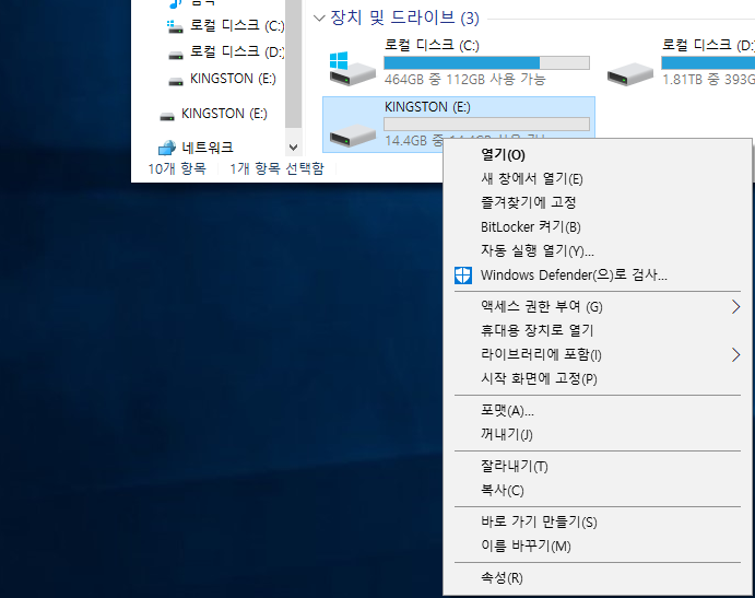 이때 "내 컴퓨터"에 들어가서 USB 드라이브를 오른쪽 클릭 -> "포맷(A)" 버튼을 눌러줍니다.