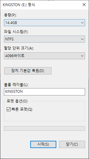 위에 창이 뜨는것을 확인할 수 있습니다. "파일 시스템(F):"에 "FAT32(기본값)" 으로 설정되어 있는 것을 "NTFS" 로 변경해주고 아래 "시작" 버튼을 눌러 UBS를 NTFS 파일 시스템으로 포맷하게 됩니다.