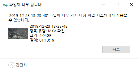 "파일이 너무 커서 대상 파일 시스템에서 사용할 수 없습니다"라는 오류가 발생된다면 파일 시스템이 NTFS 시스템으로 변경 포맷한 뒤에 다시 파일을 옮겨보시면 되기때문에 쉽게 해결 할 수 있는 문제였습니다.