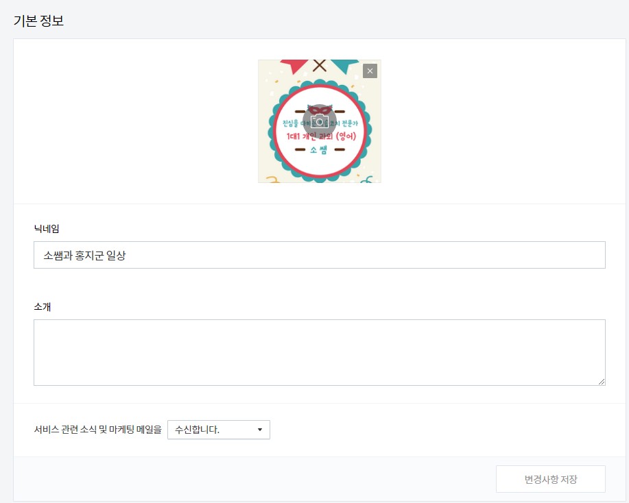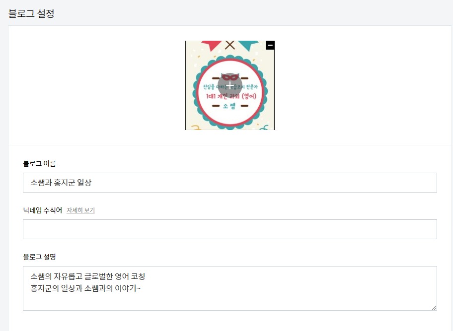 티스토리 정보에서 바꿔도 블로그에 표시가 되지 않기때문에 "블로그 설정"에서도 이미지와 블로그 이름, 닉네임 수직어, 블로그 설명을 변경해봤네요.