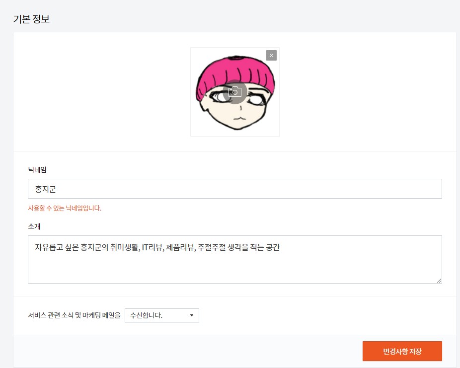 닉네임 그리고 소개도 "홍지군"과 "자유롭고 싶은 홍지군의 취미생활, IT리뷰, 제품리뷰, 주절주절 생각을 적는 공간"의 내용으로 변경을 해봤습니다.