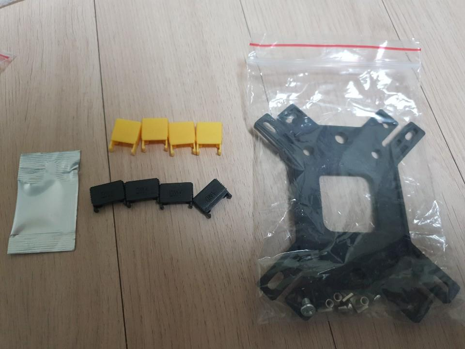 판 하나에 인텔 캡 (노랑색), AMD 캡(검정색)을 부착해서 프로세스에 맞는 캡 크기를 지정과 프로세스에 맞는 가이드를 장착해 원하는 프로세스의 소켓에 맞춰 사용할 수 있도록 되어있습니다.