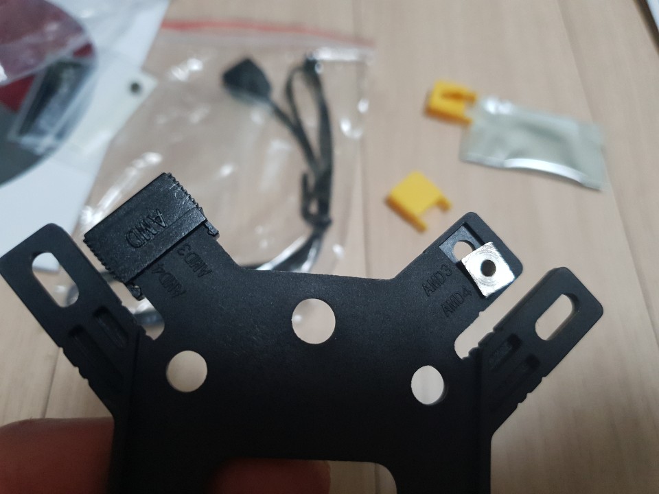 Cylon4를 고정시키기 위한 메인보드 백플레이트에 부착시킬 판에는 각각의 프로세스에 맞게 글씨가 적혀있고 저는 Ryzen7 3700X의 제품 AM4 프로세스에 맞춰 조립하기 때문에 AM4가 젹혀있는 곳에 AMD캡(검정색)을 연결시켜 주었습니다.