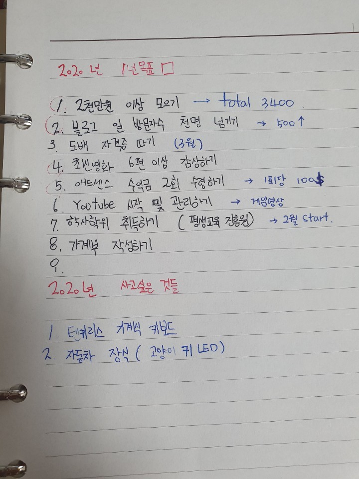 저의 2020년 목표는 2천만원 이상 모으기, 블로그 일 방문자수 1,000명 이상 달성하기, 도배 자격증 취득하기, 최신영화 6편 이상 감상하기, 애드센스 수익금 2회 수령하기 (1회당 100$), YOUTUBE 시작 및 관리하기 (게임영상), 학사학위 취득하기, 가계부 작성하기로 목표 설정을 했습니다.