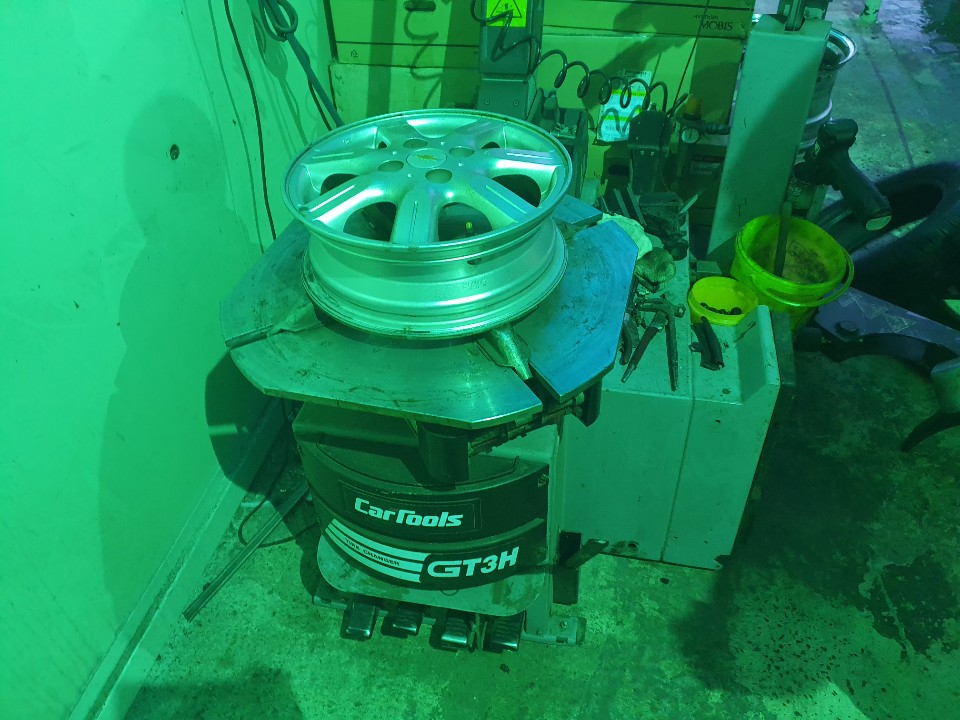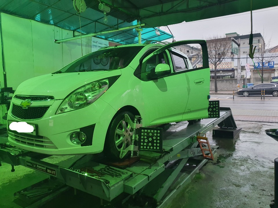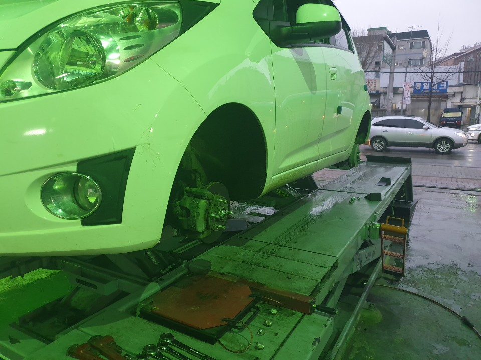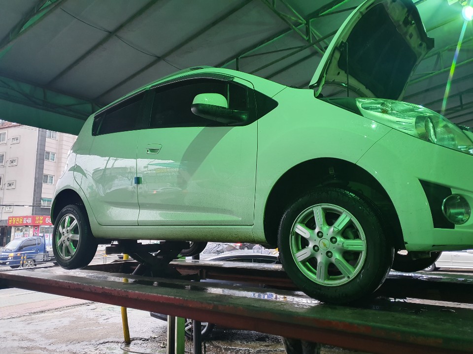 처음 얼라이먼트를 잡고!! 바퀴 교체~ 사진이 녹색인건.. 카센터의 조명때문에.. 그렇다네요.. 바퀴가 없어 앙상해진 스파크..