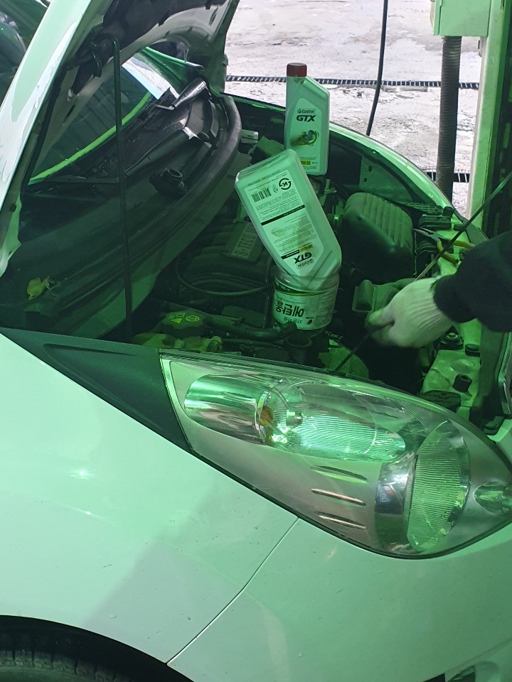 먼저 엔진오일을 교체했습니다. 차를 높게 띄운다음에 기존에 남아있던 엔진오일을 쭈~~~욱 시원하게 뽑아냈습니다. 그리고 혼합유?를 넣었다고 들었는데 잘 모르겠네요.