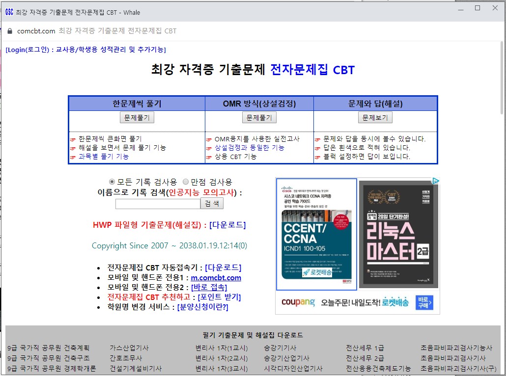 기출문제는 위에 링크를 통해 접속하시거나 네이버에서 "전자문제집 CBT"을 검색하셔서 상위에 올라와 있는 링크를 클릭해서 들어가 원하는 시험의 기출문제를 선택해서 이전에 출제됬던 시험들을 풀어보고 해설집 등을 다운로드 받을 수 있는 공간이기 때문에 다른 시험을 준비할때도 사용하시면 좋을 것 같습니다.