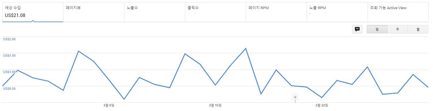 지난 1월달에는 34.42달러로 생각보다 높은 금액의 애드센스 수익금을 얻었는데 2월달에는 21.08달러의 수익금을 얻었습니다. 1월 첫 30달러 이상 달성해서 기대치가 높아진 만큼 2월달의 21.08달러에서는 많이 아쉬웠습니다. 그래도 3월달 블로그 관리를 하고 기본 20달러 이상을 달성시킬 수 있는지 확인을 한번 더 해보는 3월이 되지 않을까? 생각 합니다.