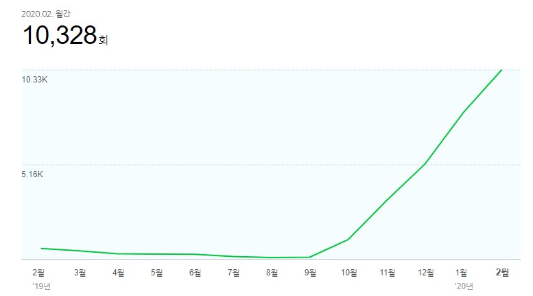 네이버 블로그는 1월 7,995명에서 10,328명으로 1월달 보다 상승했습니다. 확실히 검색 노출이 네이버에서만 반영되는 데도 티스토리 방문자수 보다 방문하는 횟수의 증가폭이 큰 것 같습니다.