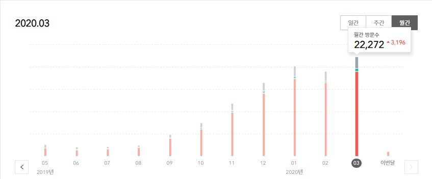 티스토리 블로그 3월의 월간 방문자수는 22,272명 2월달에 비해서 3,196명 증가 2월달에 비해 2일이 더 많지만 2월달에 비해서 일일 방문자수가 소폭 상승했습니다.