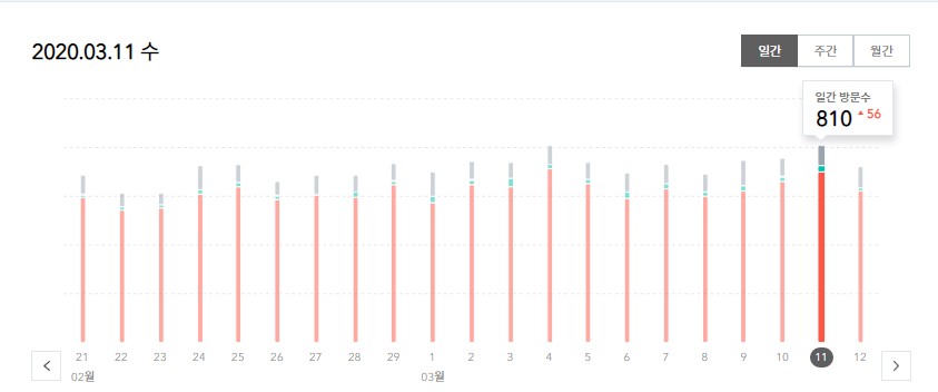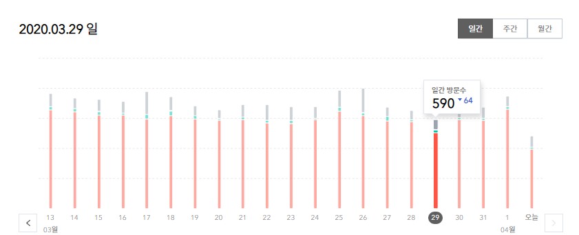 3월달에는 평균치로 본다면 일평균 700명 초반대의 일 방문자수를 보여주었고 가장 높은 방문자수는 810명 가장 낮은 방문자수는 590명이었습니다. 600명 밑으로 떨어진건 29일 하루였네요. 하루가 떨어진 만큼 티스토리 블로그에서 처음으로 일 방문자수 800명을 넘었습니다..