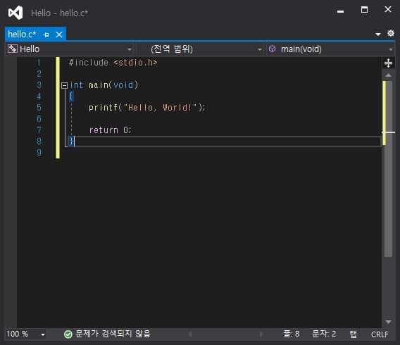 hello.c 텍스트 편집기가 실행이 되어지고 해당 영역에 "Hello, World!"를 출력해주기 위한 소스를 입력해줍니다.